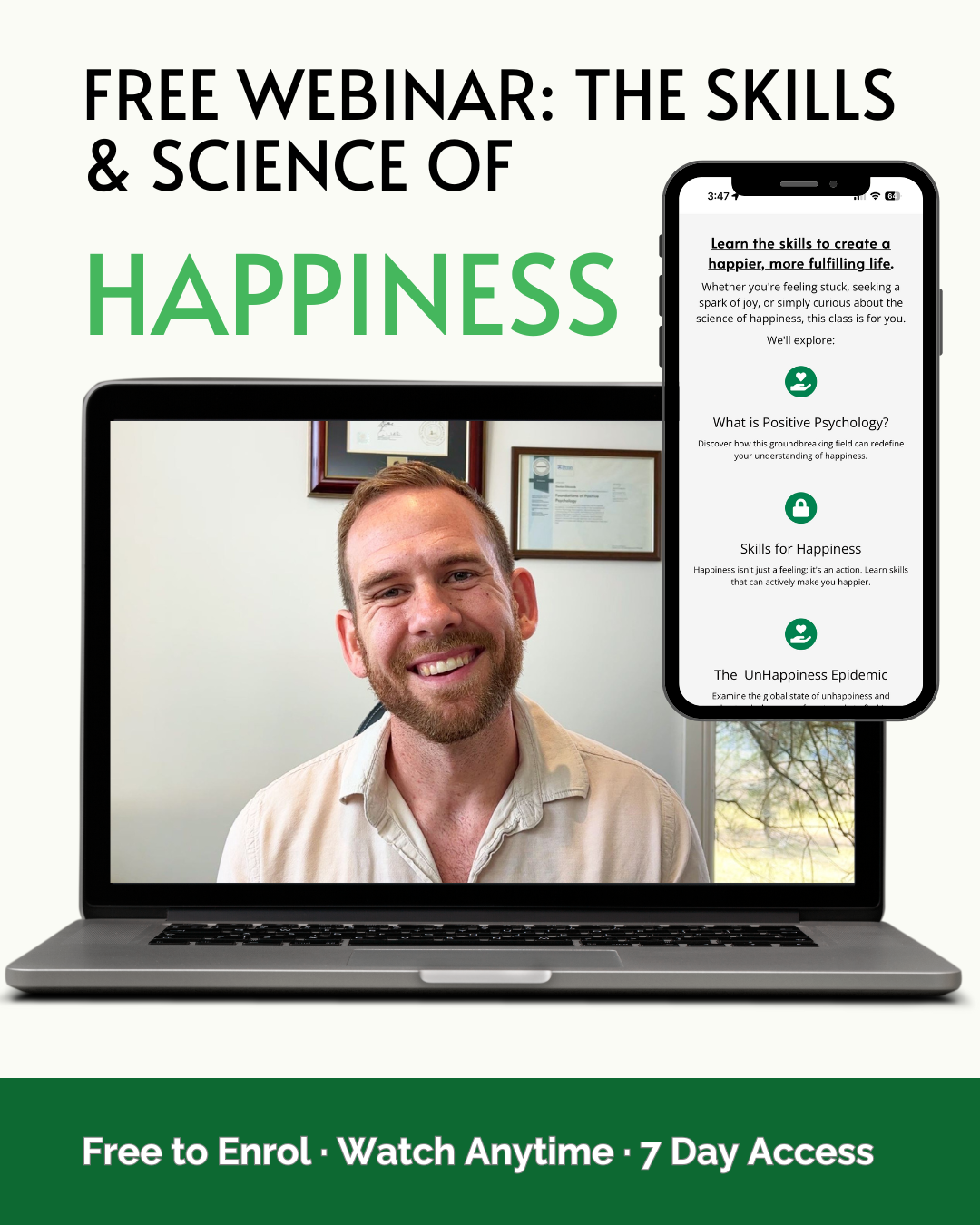 After accessing the webinar you'll have 7 days to complete it. This is to make sure your happiness doesn't end up permanently in the "I'll do it later" box.